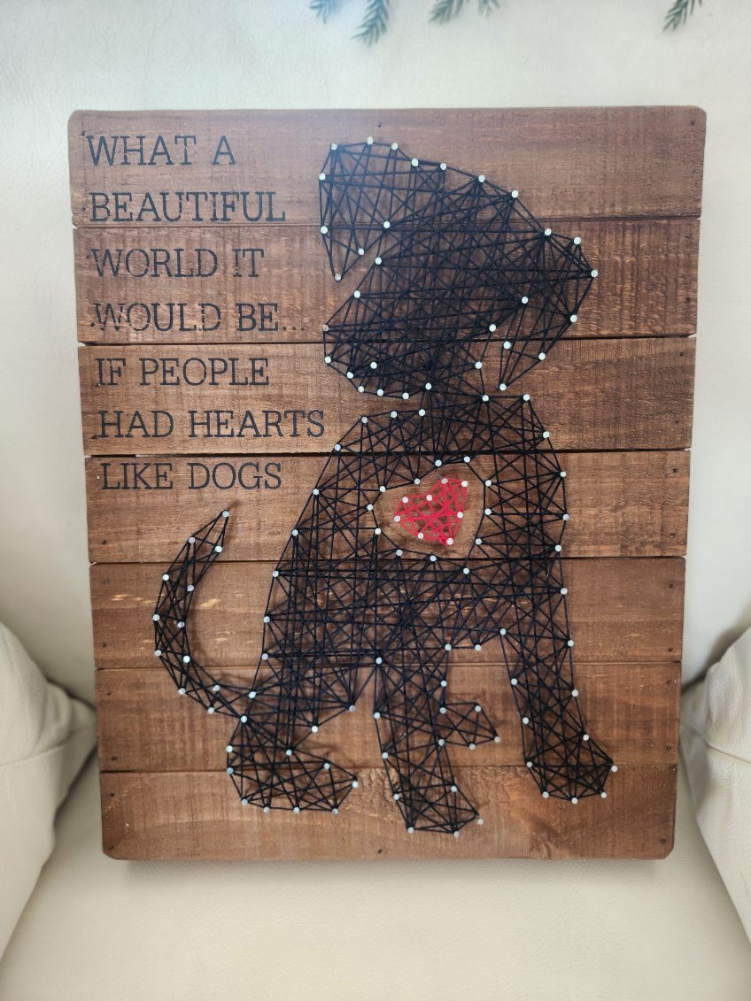 A charming plaque featuring string art of a dog paired with a sweet saying. A similar piece sparked a bidding battle in a previous year—so this one may get competitive.